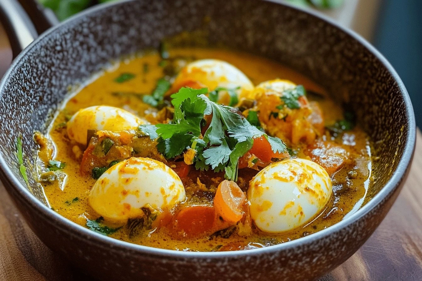 Picture the moment the first golden drop of coconut milk hits the hot oil—there’s a subtle pop, a fragrant steam that smells like tropical mornings and distant spice markets. The aroma swirls around the kitchen, pulling every corner into a fragrant vortex that makes even the most skeptical palate sigh in anticipation. The sound of onions caramelizing is a comforting, almost rhythmic whisper that promises depth. As the curry simmers, the colors shift from pale yellow to a warm amber, turning the pot into a liquid sunset. The texture is a silky, velvety base that clings to each egg, turning every bite into a moist, protein‑rich hug. I dare you to taste this and not go back for seconds.